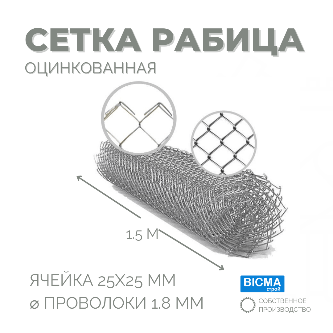 Сетка рабица оцинкованная яч.25х25мм., d/1,8, h/1.5х10м.п. (концы загнуты с одной стороны)