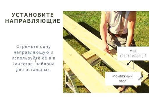 Расстелите геотекстиль, насыпьте гравий, затем установите направляющие. Отметьте угол спуска на нижней части направляющих и выемку 2 на 10 см на нижнем конце. Эта выемка будет располагаться на колышке, закрепленном на монтажной площадке. Отрежьте одну направляющую и используйте её в в качестве шаблона для остальных.