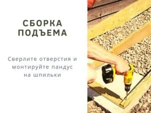 Инструментарий для монтажа пандуса: рулетка измерительная, молоток, уровень, киянка, циркулярная пила, дрель, лобзик, кельма, цемент, иные материалы для бетонирования, пиломатериалы, крепеж, фурнитура.