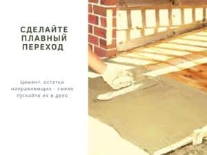 Чтобы сделать гладким переход между площадкой и пандусом, нанесите кистью латексную замазку на бетон и загладьте кельмой переходную полосу шириной 20 см у нижнего края настила. Прибейте обрезки от направляющих к внешним краям пандуса, чтобы сформировать границы бетонного подъема. Залейте бетон под первую доску настила и зашлифуйте под тем же углом, что и формы из обрезков.